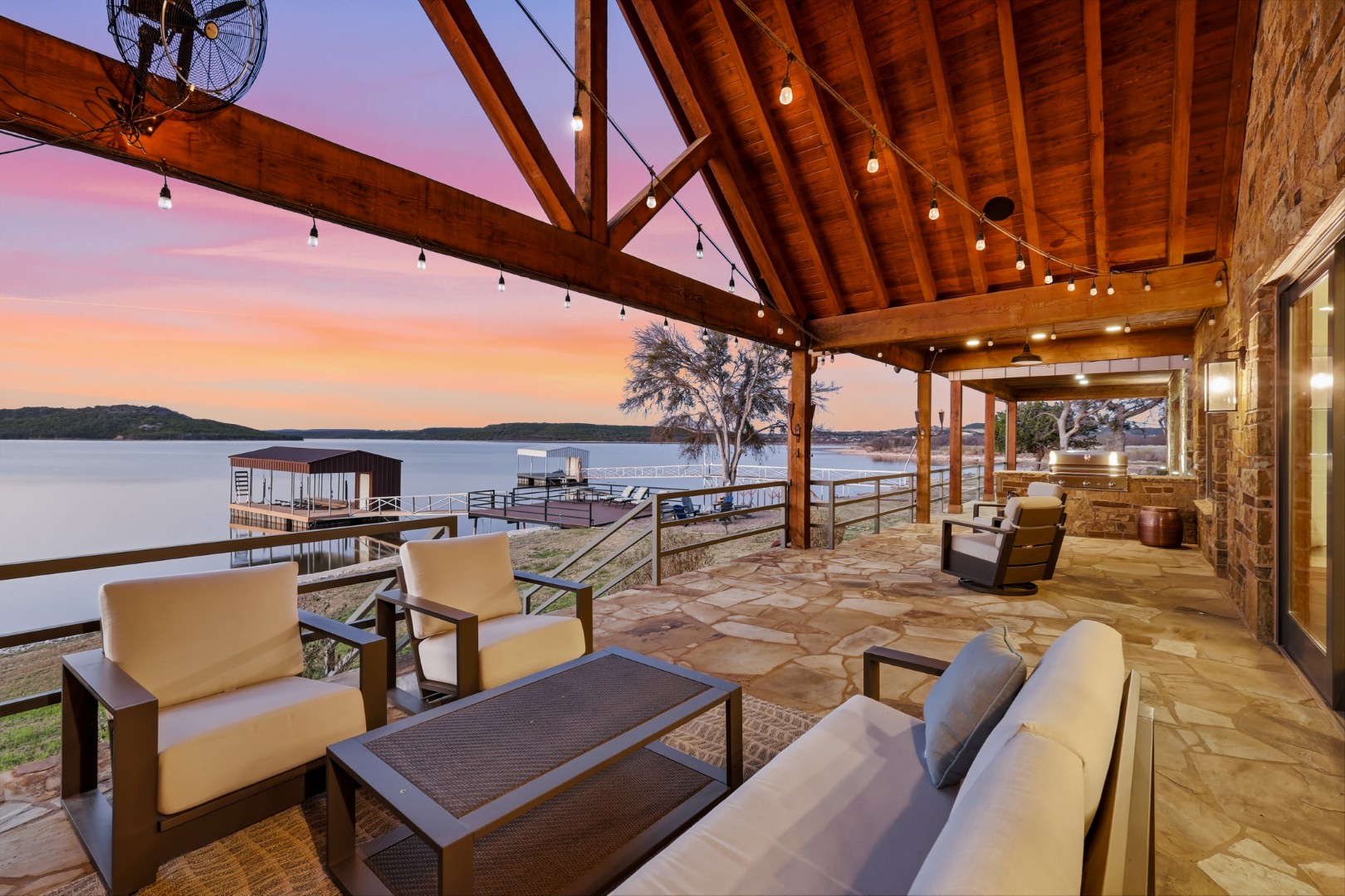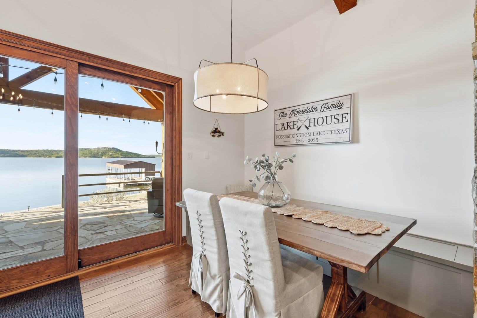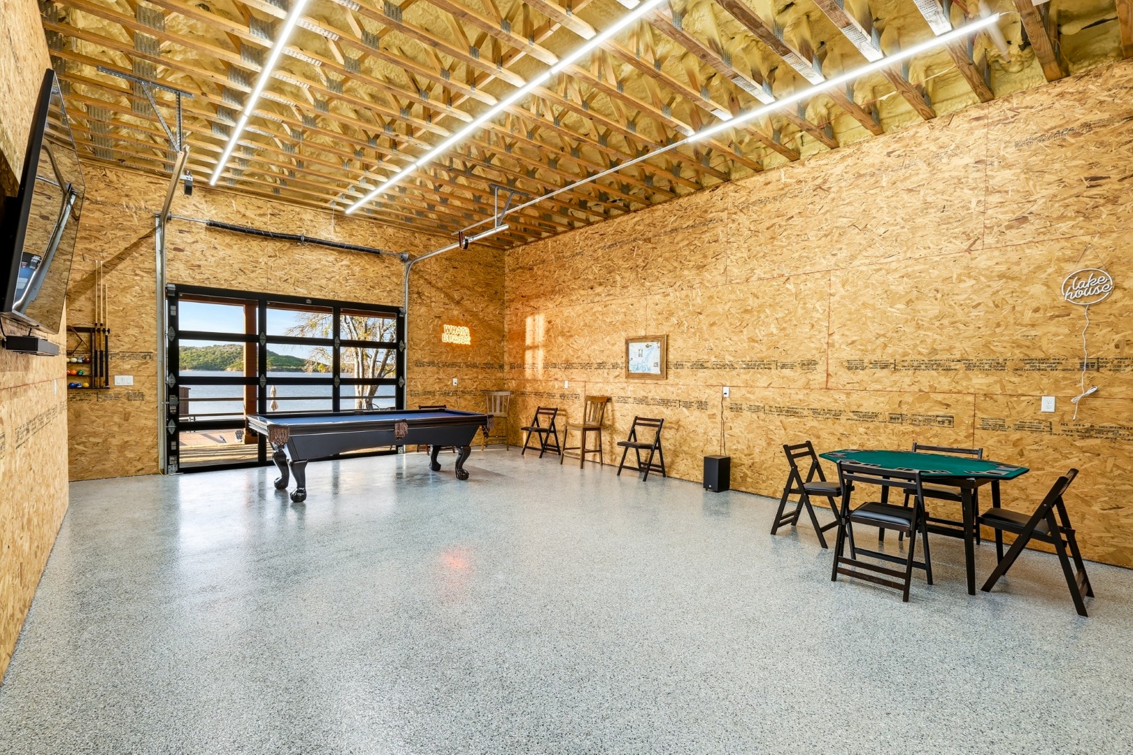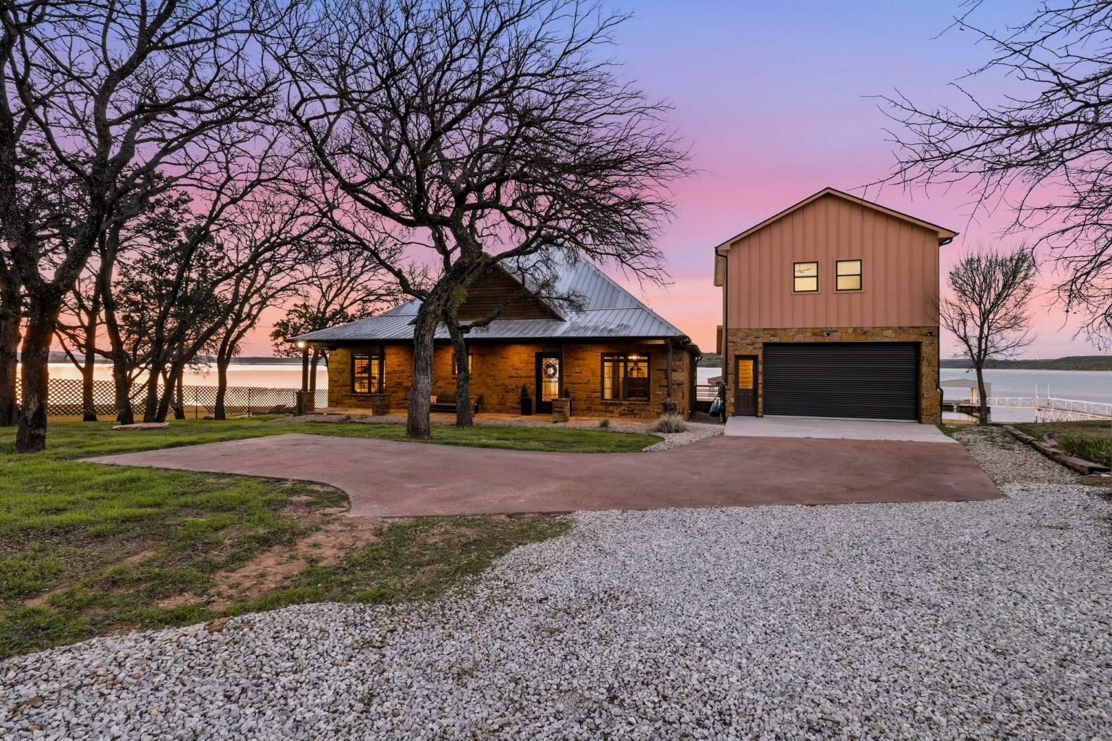 Wake up to peaceful lake views in this stunning lakeside retreat designed for relaxation and entertainment. Perfectly positioned on the water, this home features direct lake access and a private dock, making it easy to spend your days boating, fishing, or simply enjoying the serenity of the shoreline. Step outside to the oversized back patio, an ideal space for hosting gatherings, outdoor dining, or watching spectacular sunsets over the water. Whether you’re sipping your morning coffee or winding down in the evening, the outdoor living space offers a front-row seat to lake life. The main house can sleep up to 11 guests. The Game Garage has a pool table, card table, dart board and TV with sound bar. A Guest Suite with Mini Fridge, Microwave, Coffee maker, Washer/Dryer and Queen bed upstairs (is available with full sleeping capacity of the home can be rented for an extra charge – contact to rent) ***Only 8-10 minutes from Rocker B Ranch***