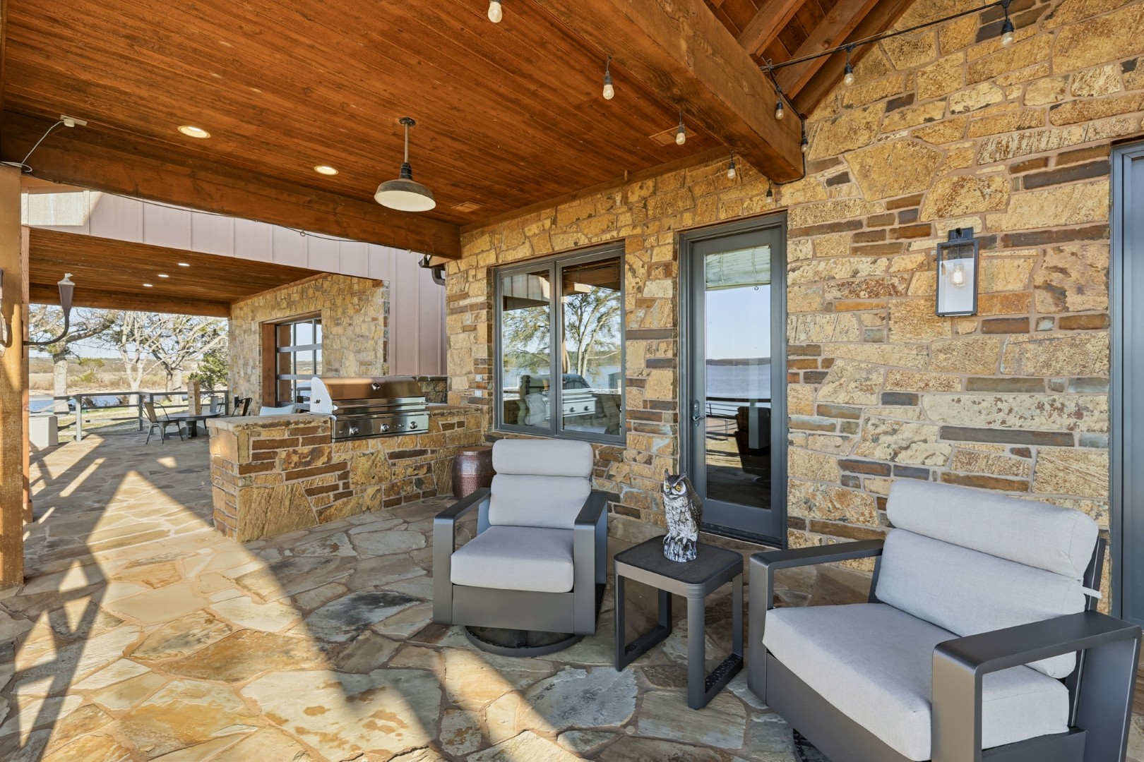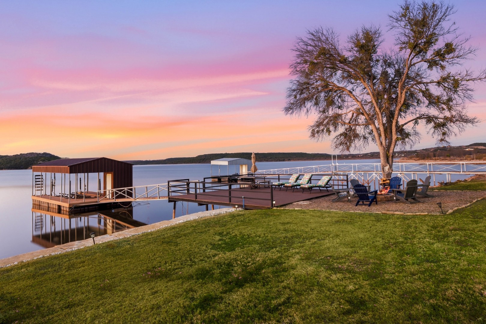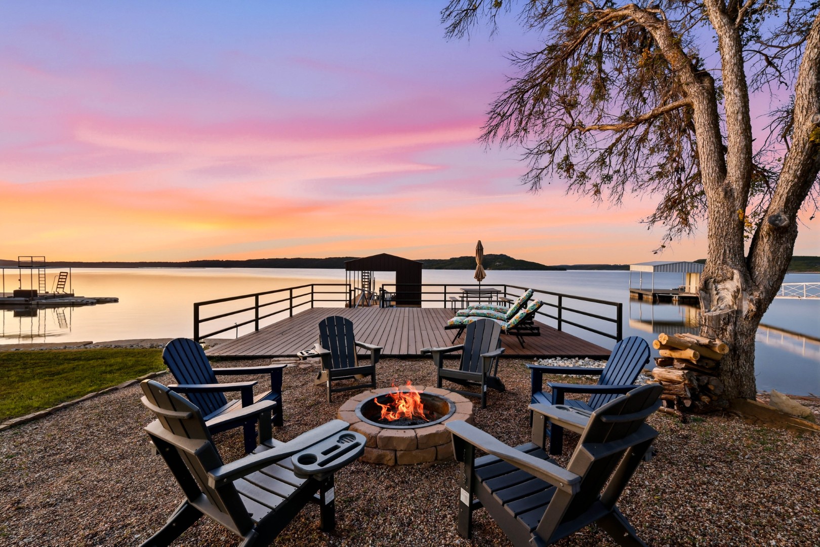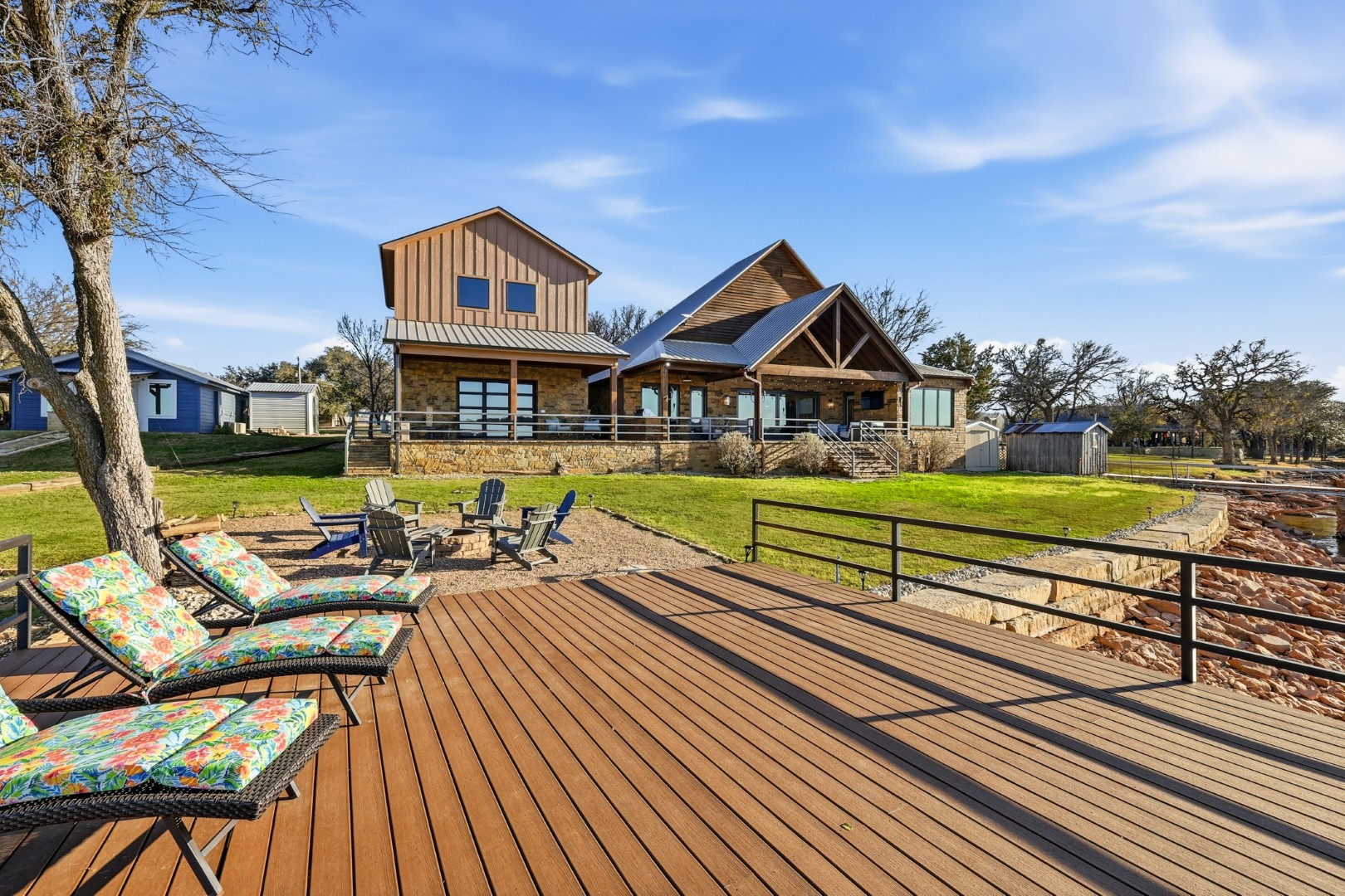 Wake up to peaceful lake views in this stunning lakeside retreat designed for relaxation and entertainment. Perfectly positioned on the water, this home features direct lake access and a private dock, making it easy to spend your days boating, fishing, or simply enjoying the serenity of the shoreline. Step outside to the oversized back patio, an ideal space for hosting gatherings, outdoor dining, or watching spectacular sunsets over the water. Whether you’re sipping your morning coffee or winding down in the evening, the outdoor living space offers a front-row seat to lake life. The main house can sleep up to 11 guests. The Game Garage has a pool table, card table, dart board and TV with sound bar. A Guest Suite with Mini Fridge, Microwave, Coffee maker, Washer/Dryer and Queen bed upstairs (is available with full sleeping capacity of the home can be rented for an extra charge – contact to rent) ***Only 8-10 minutes from Rocker B Ranch***