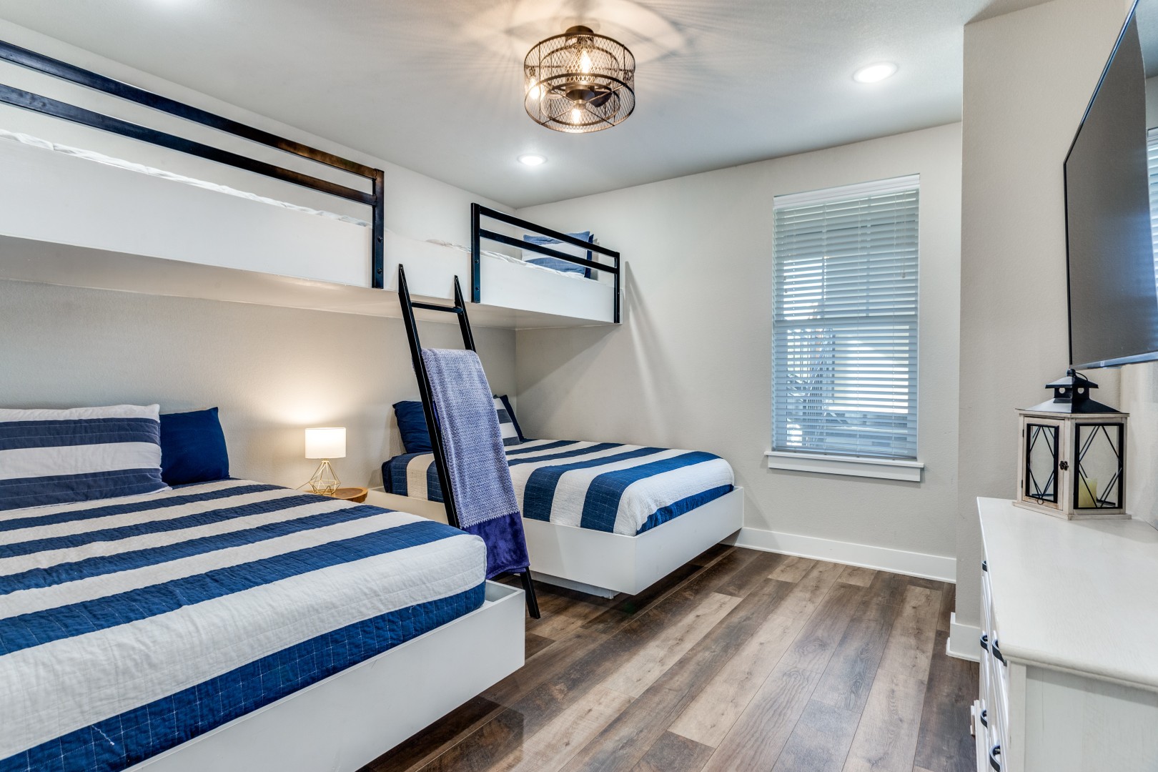 Inside you will find brand new luxury amenities. The master suite has a king bed with beautiful harbor views, smart TV, and master bath has a double vanity with oversized shower. Front bedroom has two Queen beds with built in twin bunks above and a 55″ Smart TV. The guest bathroom is adjacent to the bedroom and has large soaking tub and shower.